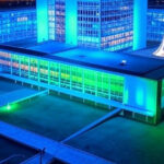 Fachada do TJDFT em Brasília com fitas roxas simbolizando webinário sobre ciúme e violência doméstica.